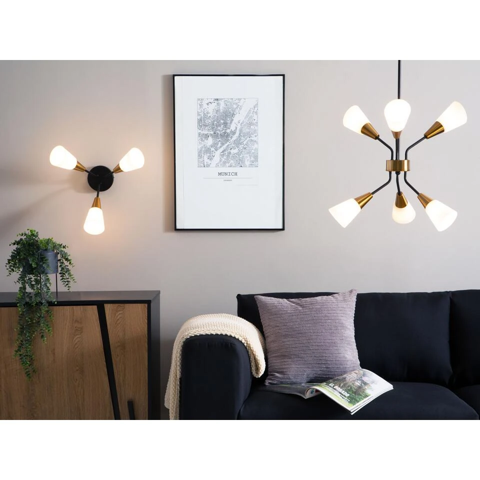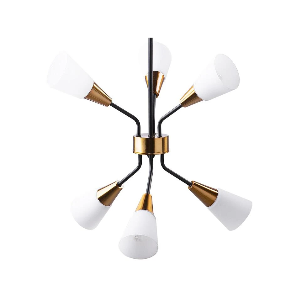 Kroonluchter met sprankelende kristallen elementen. Deze plafondlamp heeft alles wat een klassieke lamp nodig heeft – elegante kleuren, stijlvolle vorm en veel lichtbronnen. De structuur is gemaakt van metaal in diep zwart, terwijl de conische lampenkappen zijn gemaakt van wit glas, dat een aangenaam, helder licht uitstraalt. Dankzij de gouden decoratieve elementen straalt de lamp een speciale en tegelijkertijd elegante uitstraling uit.