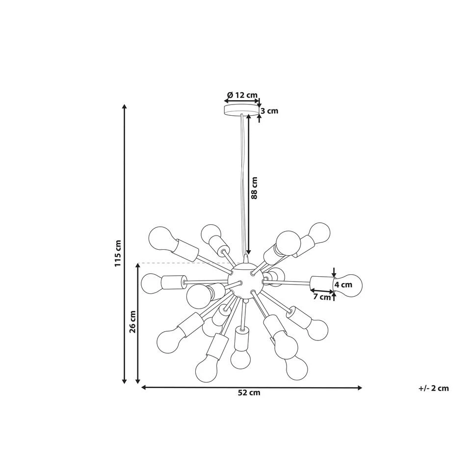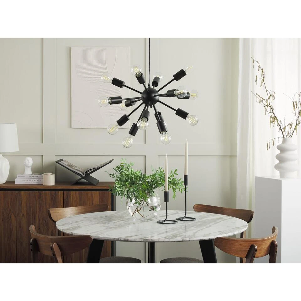 Moderne Plafondlamp. Verfraai je woonkamer of eetkamer met deze mooie moderne hanglamp. De lamp is gemaakt van ijzer en heeft een zwarte afwerking, die een minimalistische touch geeft aan elk interieur. In het karakteristieke ontwerp passen 15 decoratieve gloeilampen, waardoor zijn stijl tot recht komt, terwijl de kamer volledig wordt verlicht.