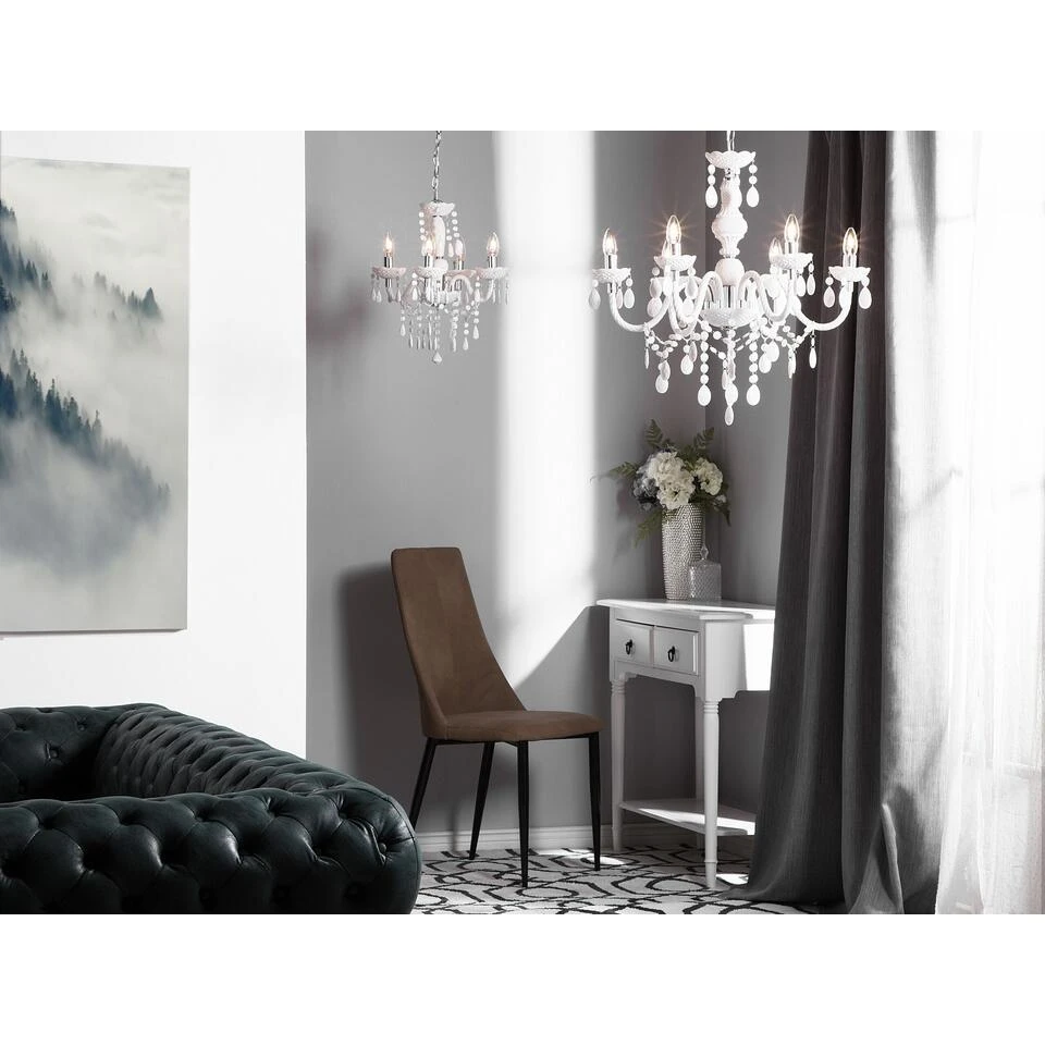 Kroonluchter met sprankelende kristallen elementen. Qua sierlijkheid is deze betoverende kroonluchter moeilijk te verslaan. De vier gebogen lichtarmen van wit plastic zijn uitgerust met sprankelende kristallen elementen, die mooie lichteffecten bieden. Zonnestralen en kaarslicht worden weerspiegeld in de decoratieve elementen en omhullen de kamer in warm licht. Een hoogtepunt voor alle klassieke en elegante interieurs. De lamp is voorzien van een transparante kabel en robuuste kettingophanging.