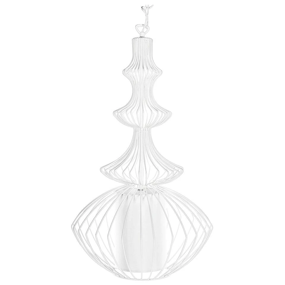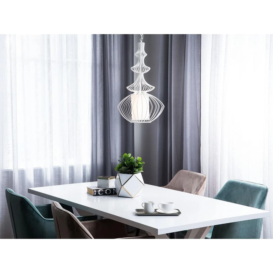 Witte hanglamp in extravagante vorm. Met de unieke vorm en constructie van metaal in mat wit is deze hanglamp het hoogtepunt in jouw huis. De lamp bestaat uit een frame dat doet denken aan een kerstboom – een modern accessoire dat ook als lichtbron dient.