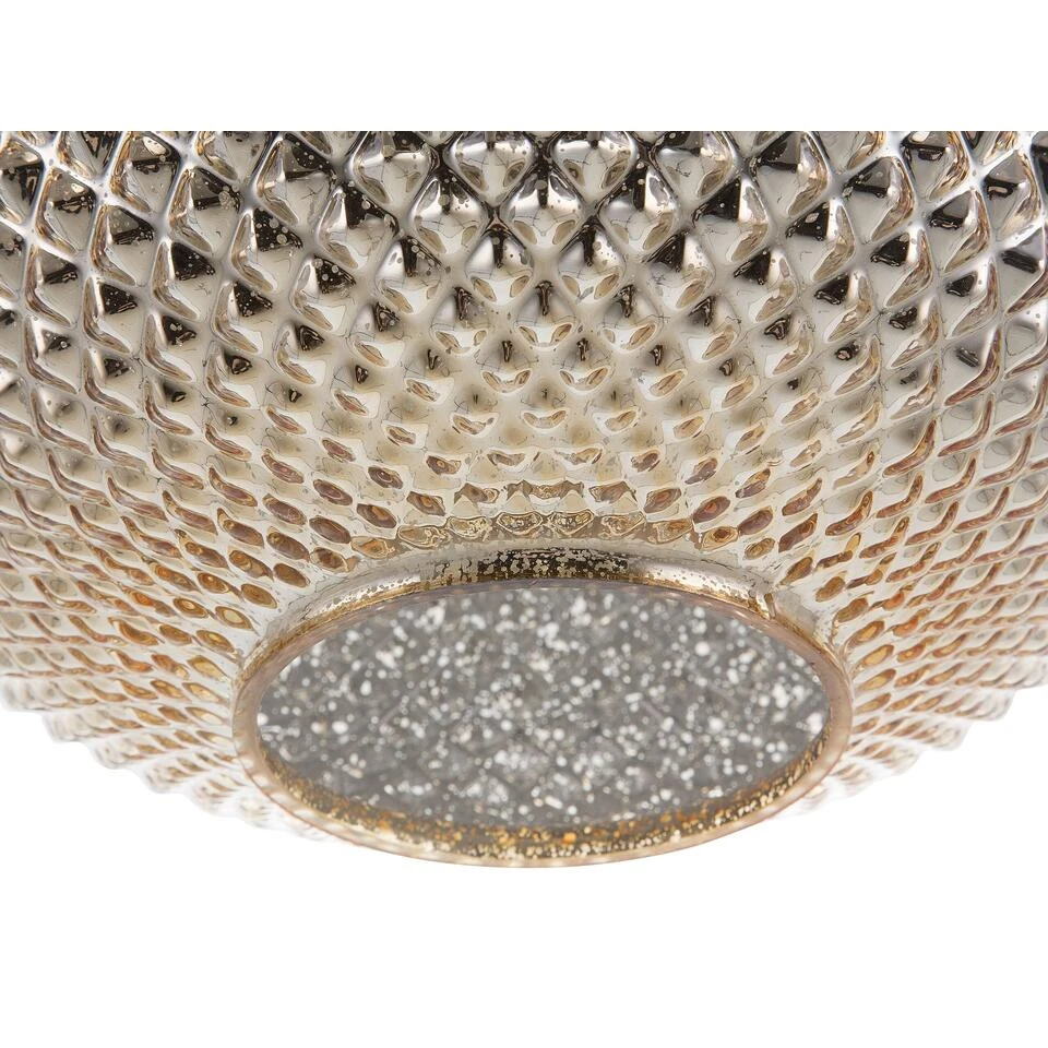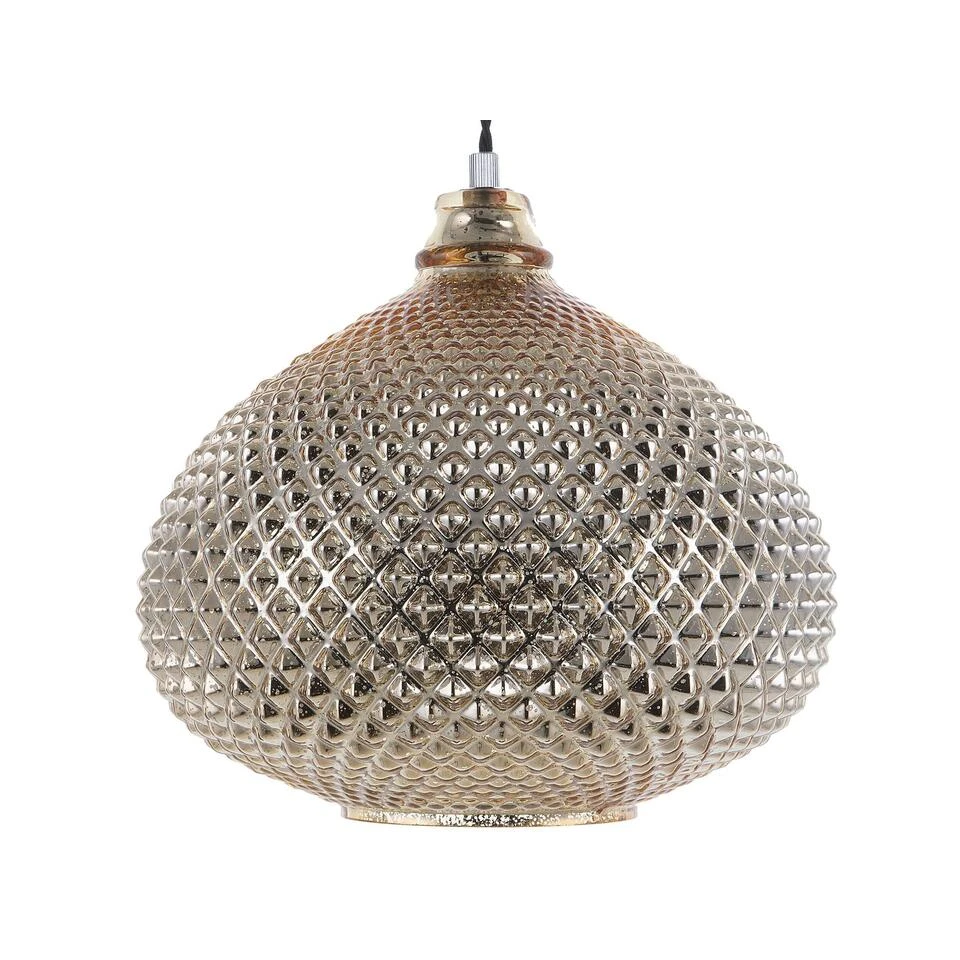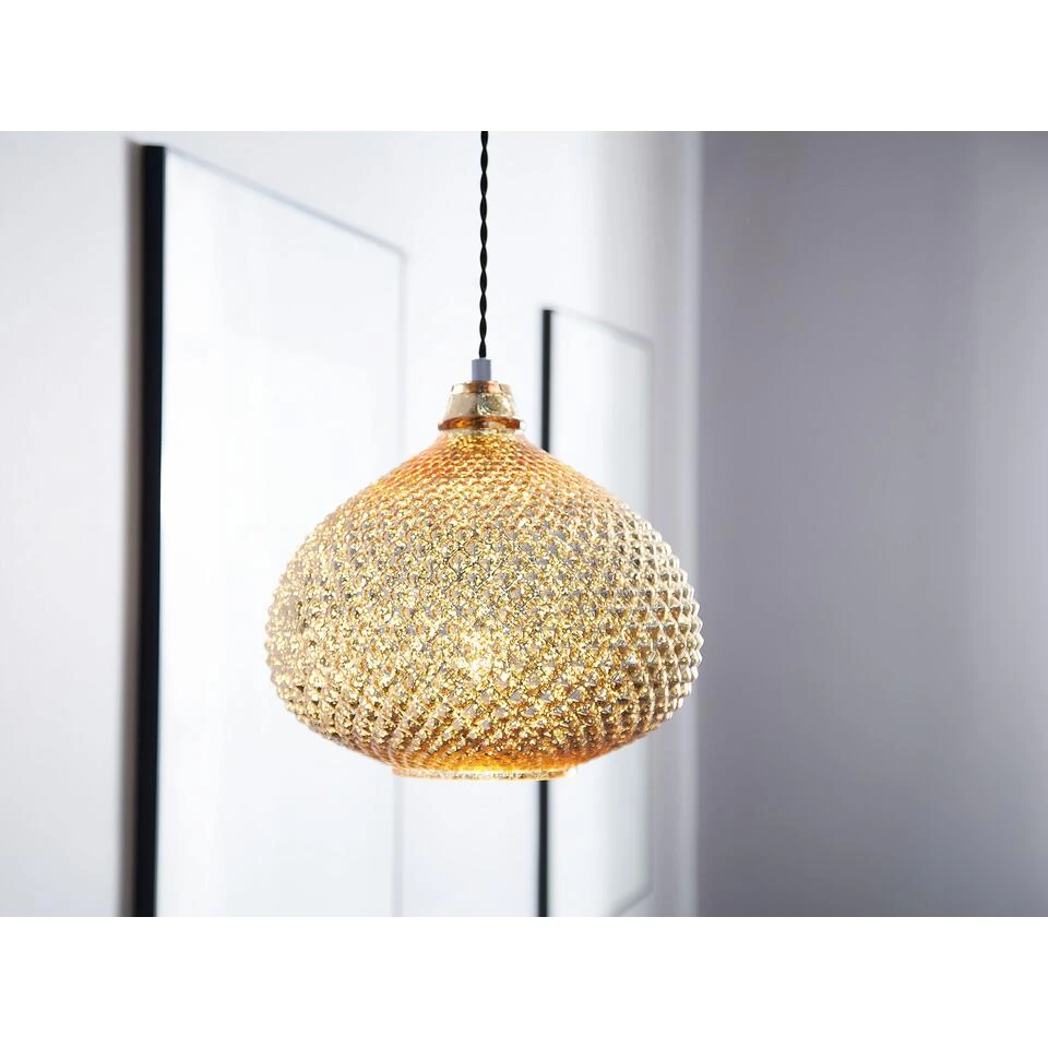Verfijnde hanglamp met goudkleurig glas. De ronde, gebogen lampenkap is ontworpen van goudkleurig glas en maakt deze hanglamp een mooie toevoeging aan jouw huis. Het gestructureerde oppervlak geeft het een romantische uitstraling en zorgt voor mooie lichteffecten. De hanglamp past als een stijlvolle blikvanger voor alle moderne, romantische en speelse woonstijlen en is ook ideaal voor een mix van stijlen. De hanglamp is uitgerust met een zwarte textielkabel.