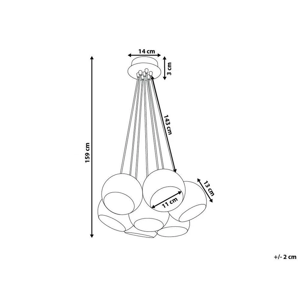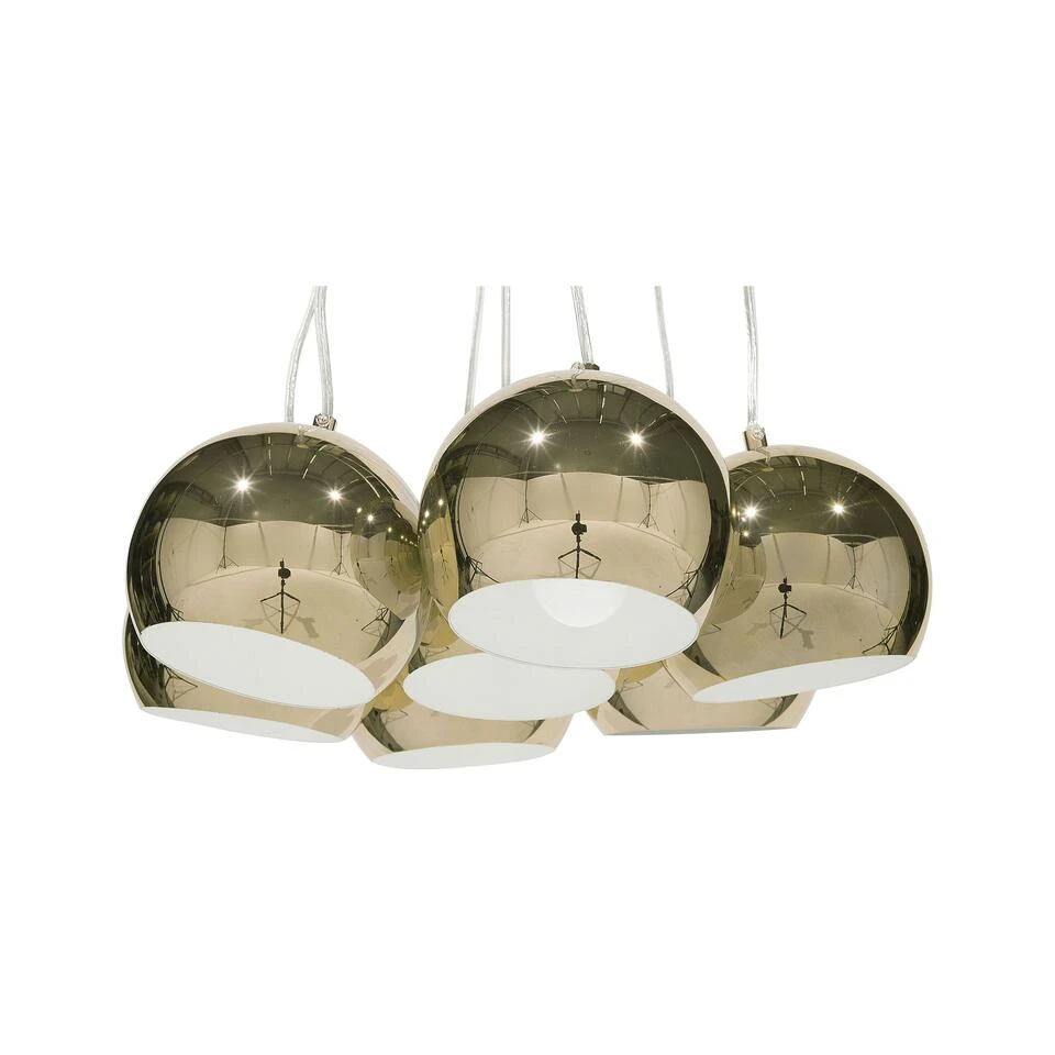 Designer lamp in goud. Deze hanglamp, bestaande uit 7 lichtelementen, is een echte blikvanger in jouw huis. De bolvormige lichten zijn goud geverfd. Samen met de transparante kabels laat deze lamp jouw huis stralen.
