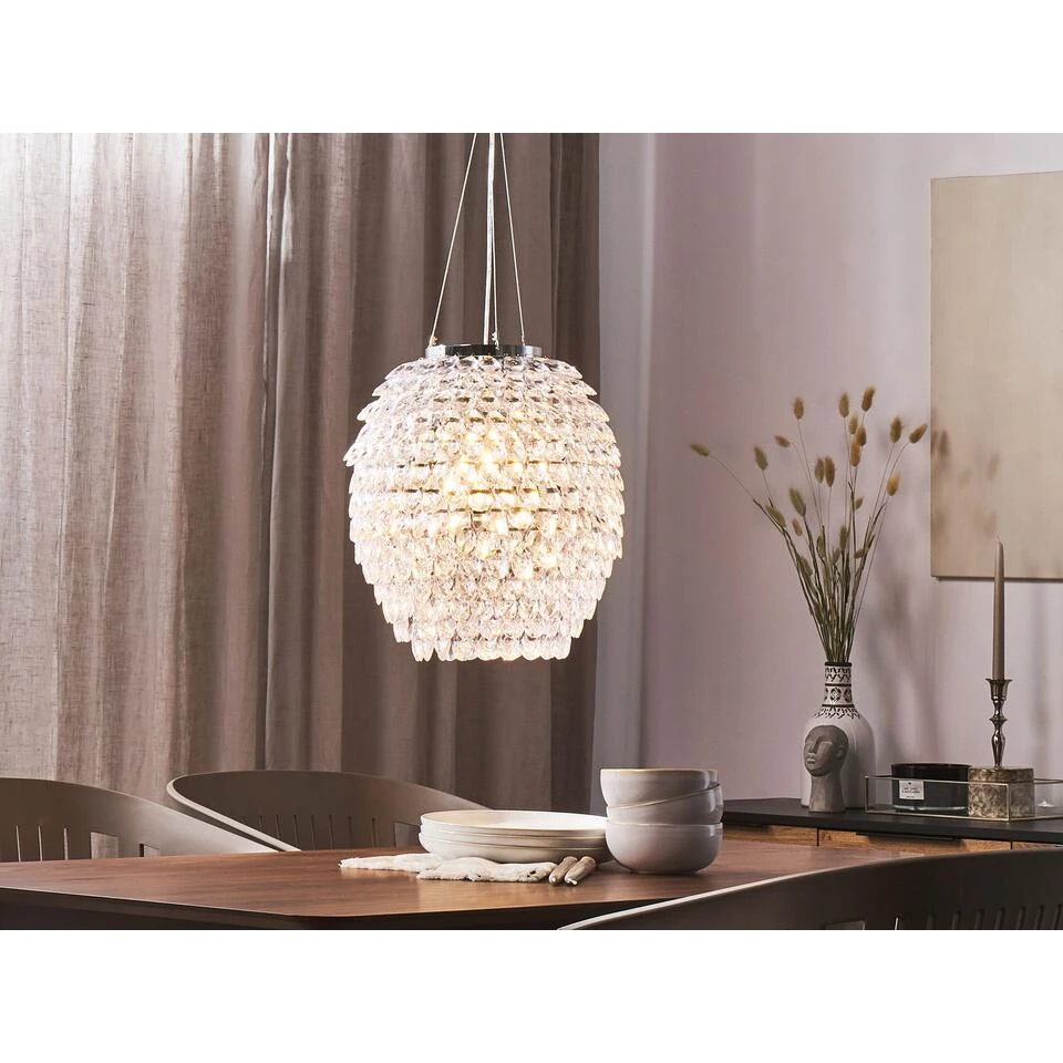Glanzende hanglamp van chroom. Deze chique en decoratieve hanglamp geeft jouw huis extra sfeer. Het frame van de ovale lampenkap is gemaakt van stevig, verchroomd metaal, versierd met veel transparante steentjes die een adembenemend lichteffect creëren. De glinsterende elementen weerspiegelen het licht en creëren een elegante sfeer in de kamer. De lamp is geschikt voor lampen met de E27-fitting met een maximum van 60W. Lichtbronnen zijn niet inbegrepen.