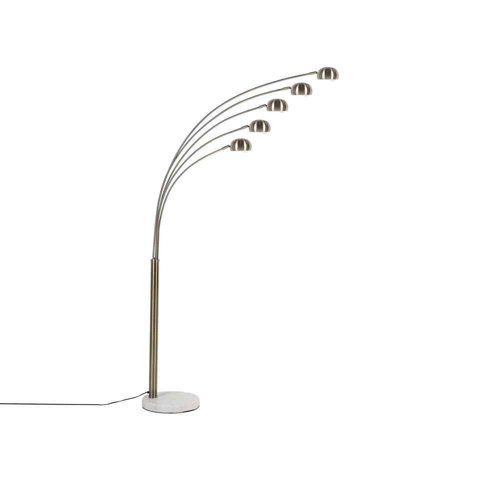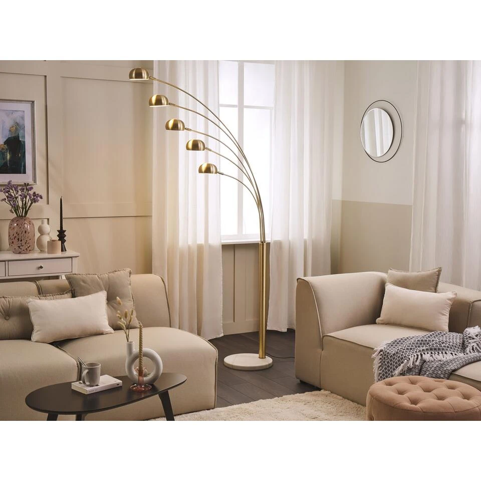 Vloerlamp van goudkleurig metaal. De stijlvolle lamp gemaakt van glanzend, gouden metaal in het populaire retro-ontwerp verheugt zich met zijn slanke, sierlijk gebogen vorm. De vijf verstelbare, ronde lampenkappen zorgen voor een optimale verlichting van je leeshoek en de robuuste lampvoet van marmer garandeert stabiliteit. De lamp is uitgerust met een zwarte PVC-kabel.