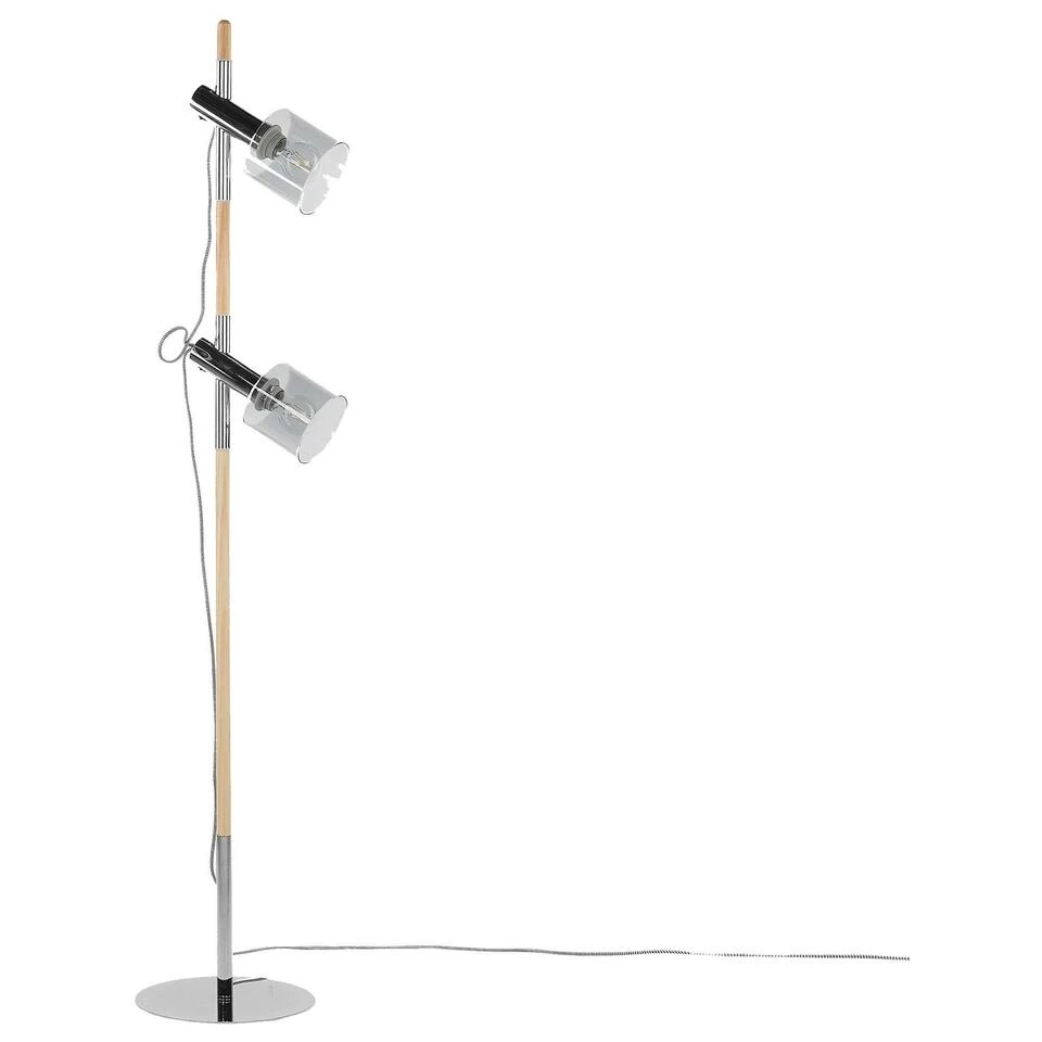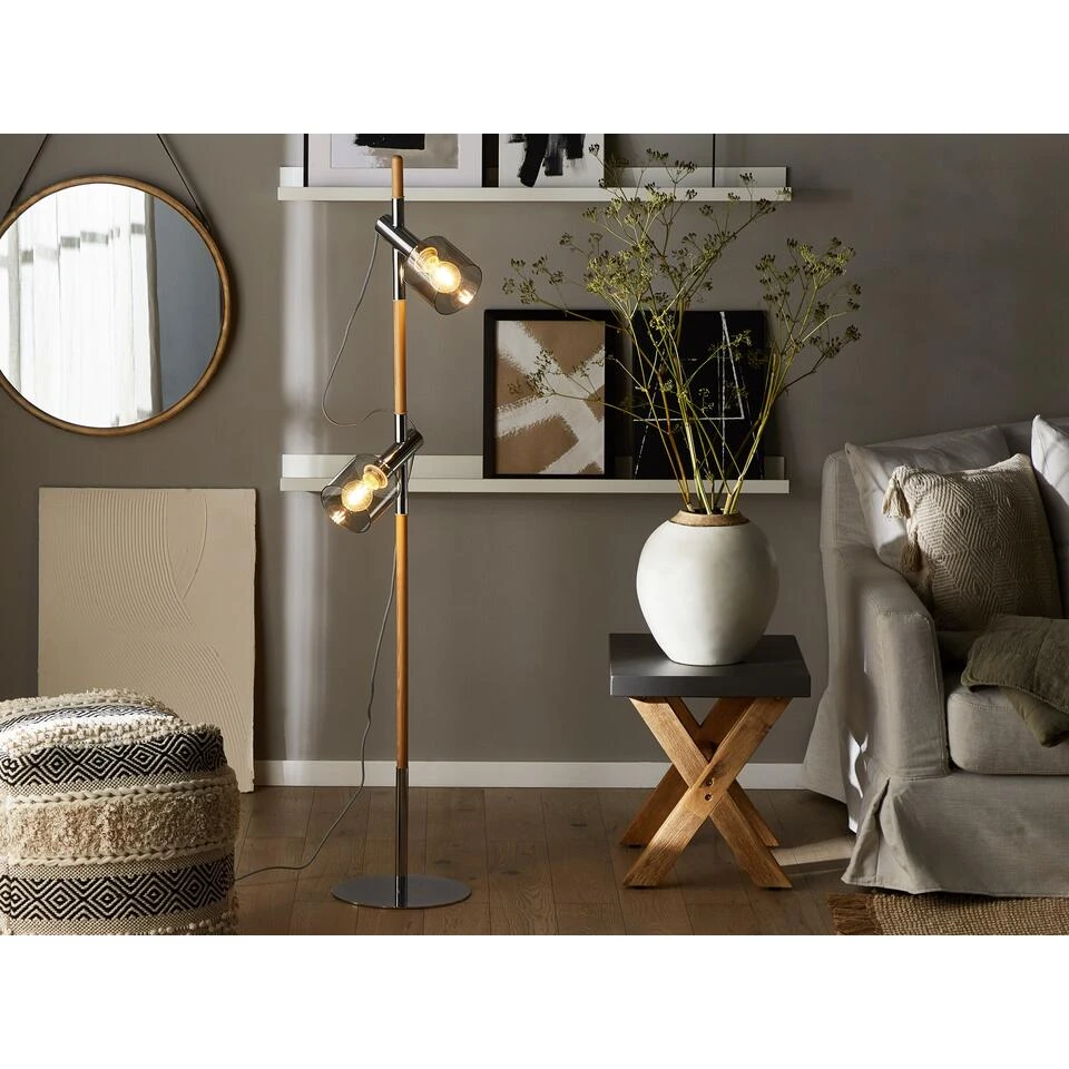 Decoratieve en moderne staande lamp met poten van essenhout en rookglazen kapjes. Deze vloerlamp geeft een strakke look aan je kamer. De combinatie zilver, rookglas en essenhout passen goed bij een modern interieur. Deze stijlvolle verlichting is ideaal als leeslamp achter of naast een bank of stoel. Zo heb je altijd goede verlichting als je een boek leest. Aan de essenhouten standaard zitten twee lampen die je van richting kunt veranderen. Zo geniet je op verschillende plekken in de kamer van goed licht. Dit is erg handig als je met z’n tweeën tegelijk wilt lezen. Ook gebruik je de lamp als bureaulamp door deze achter of naast het bureau te plaatsen.