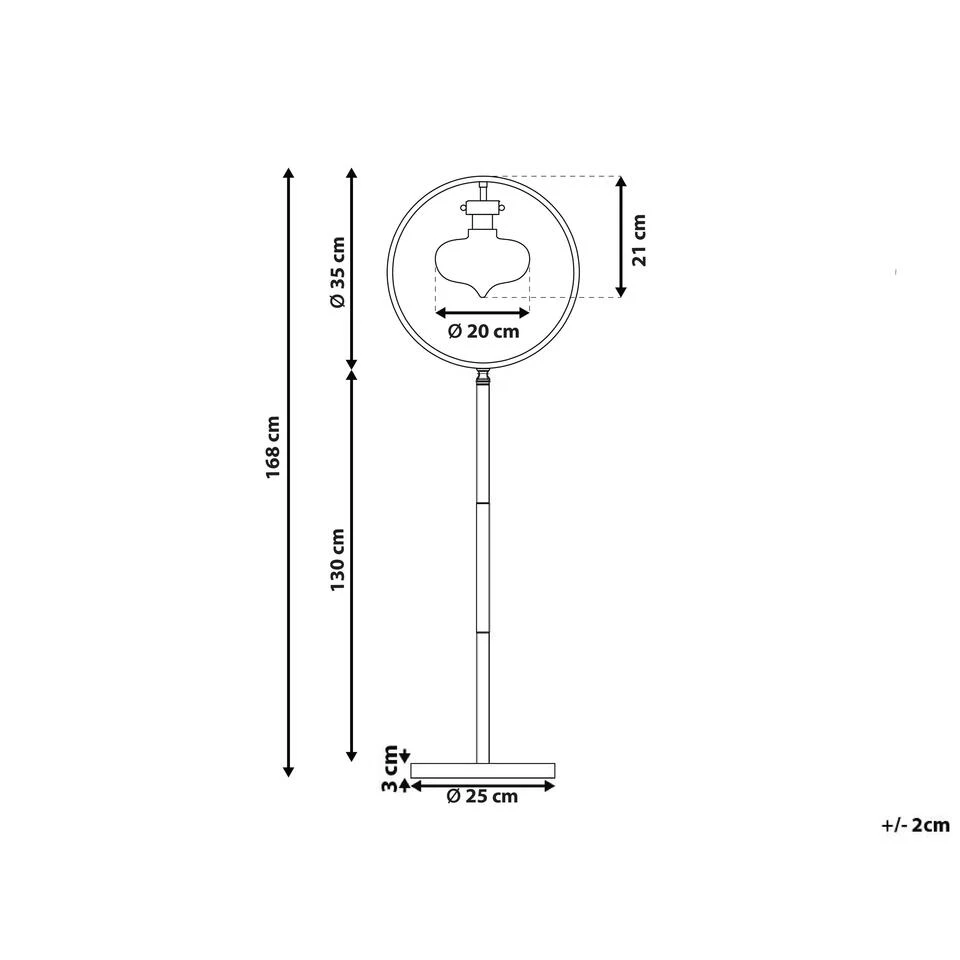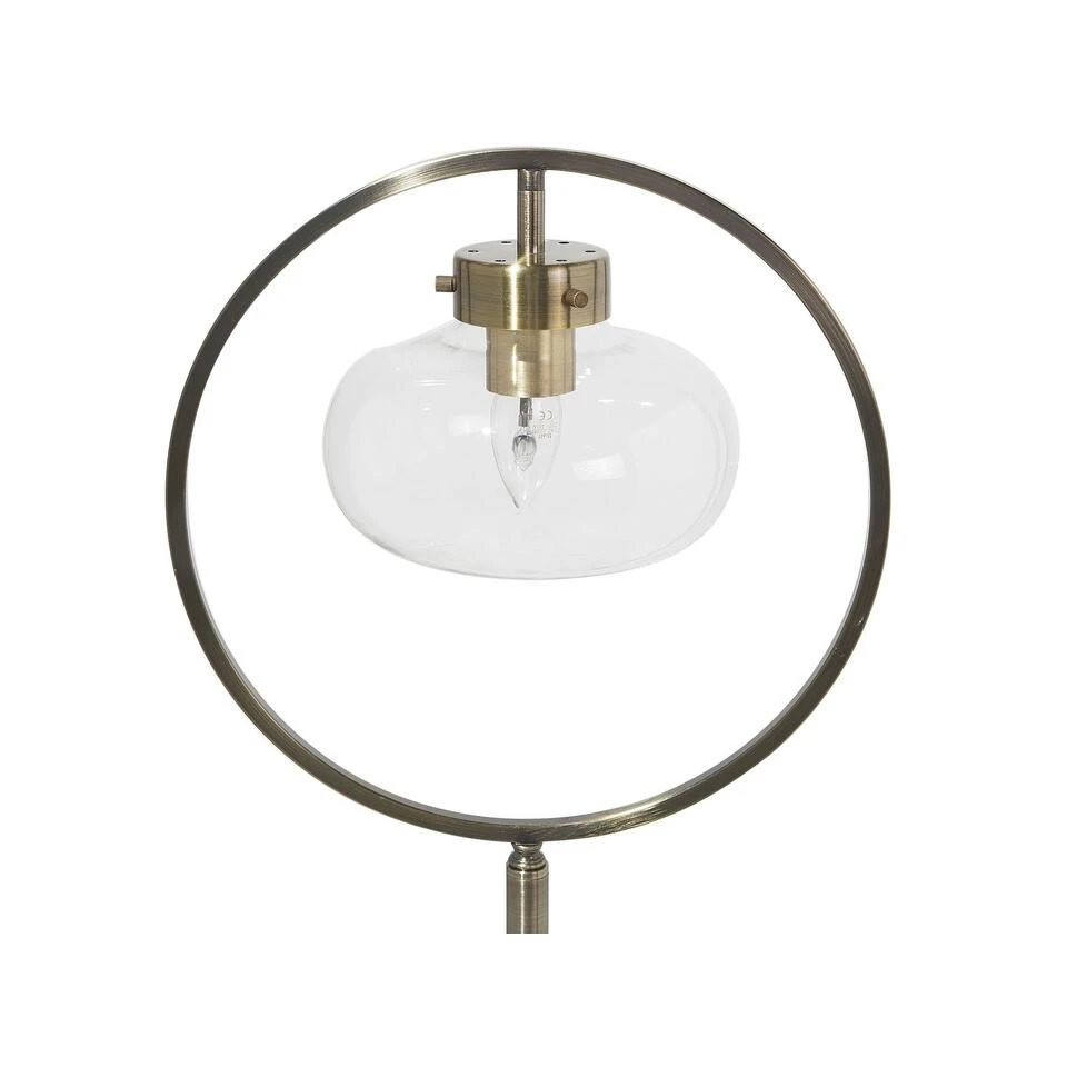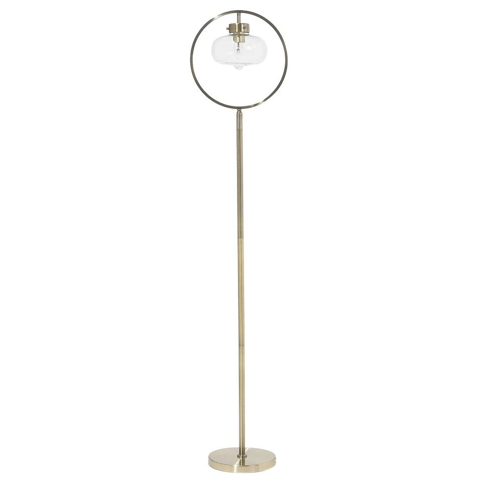 Messing gekleurde vloerlamp. Het exclusieve ontwerp van de vloerlamp onderstreept de moderne, maar tijdloze uitstraling. De lampenkap van helder glas hangt in een rond gebogen, filigraan metalen frame in messinglook. Een lamp is niet inbegrepen.