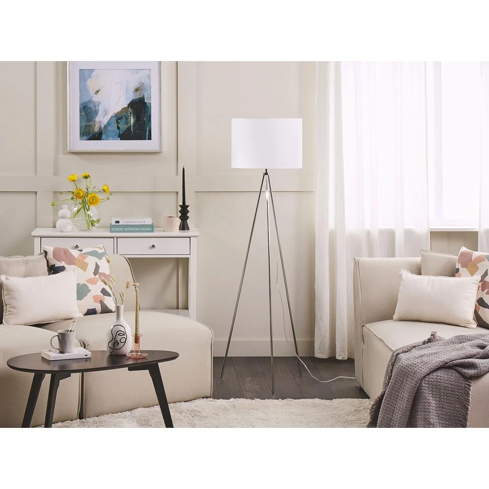Moderne, driepotige staande lamp. Met zijn moderne design en klassieke elegantie past deze stijlvolle, driepotige staande lamp discreet in elke woonomgeving. De ronde lampenkap van wit polyester rust op een stevig frame van slanke, chroomkleurige poten.