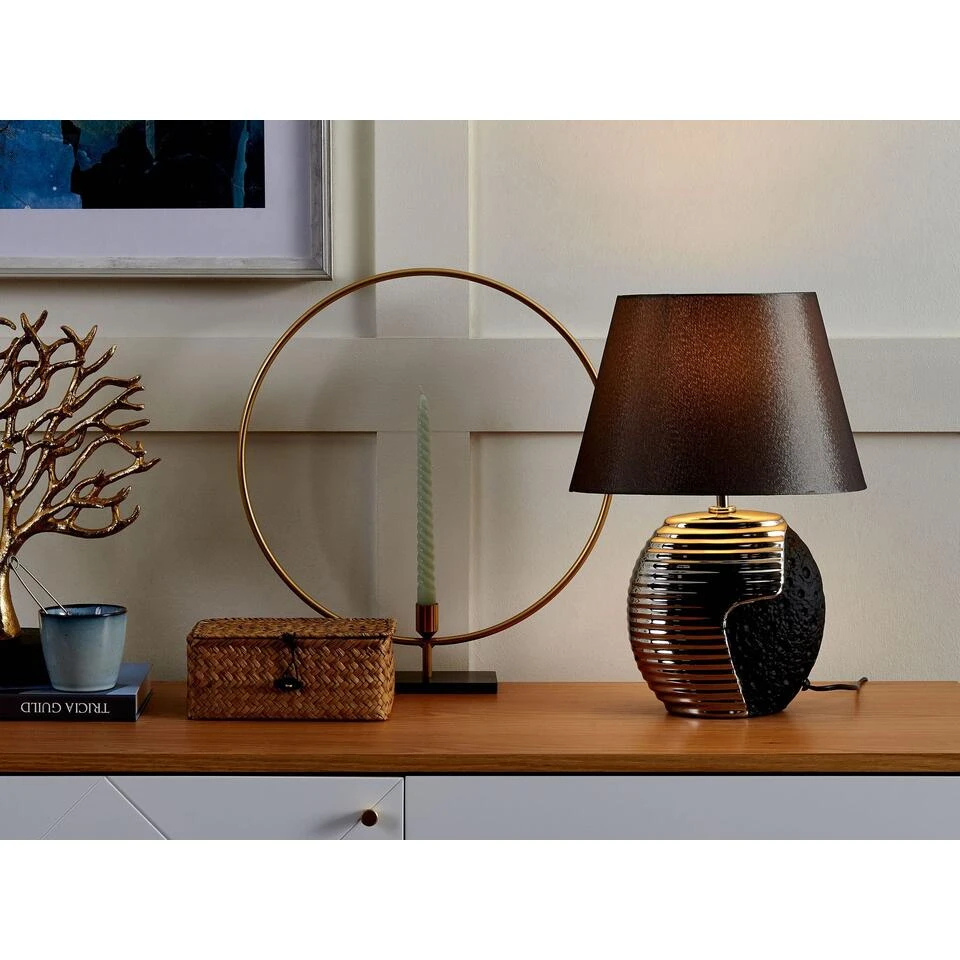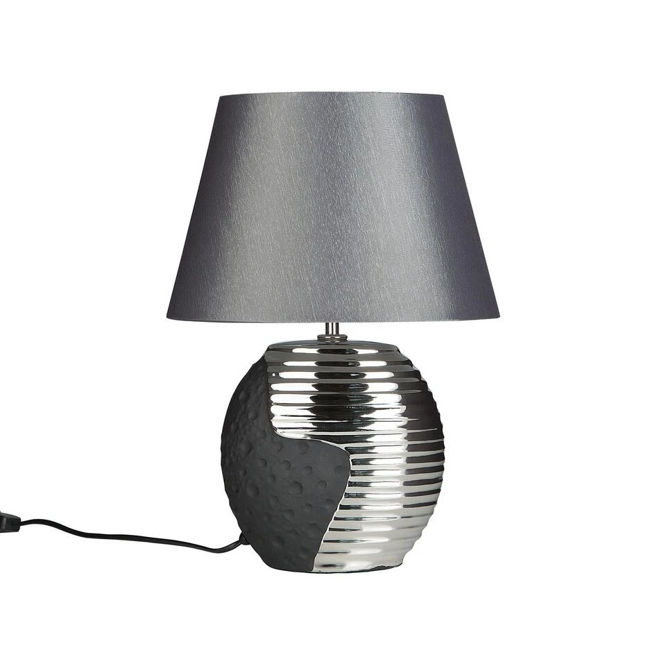 Moderne, zilverkleurige en zwarte tafellamp. Deze zwart/zilveren tafellamp is een stijlvolle en elegante keuze. De glanzende patronen geven de voet een modern uiterlijk. De designlamp is zeer licht van kleur, en past goed op zowel een bijzettafel als op een nachtkastje. De kap van de tafellamp is gemaakt van kunstmatig zijde.