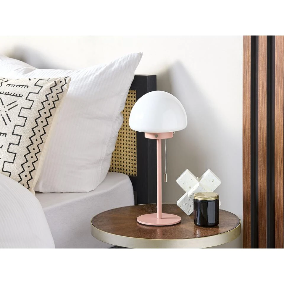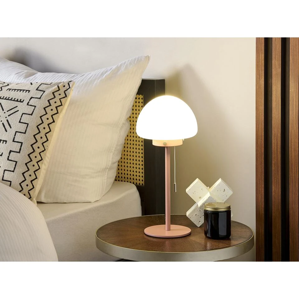 Minimalistische bureaulamp met trekkoord. Geef je interieur een upgrade met deze opvallende tafellamp. Het stuk heeft een halfronde glazen lampenkap in wit en heeft een roze basis die zeker zal opvallen en past in veel verschillende slaapkamers, woonkamers en werkkamers in retro, hedendaagse en moderne stijl. De lamp is gemakkelijk aan en uit te zetten dankzij het trekkoord.