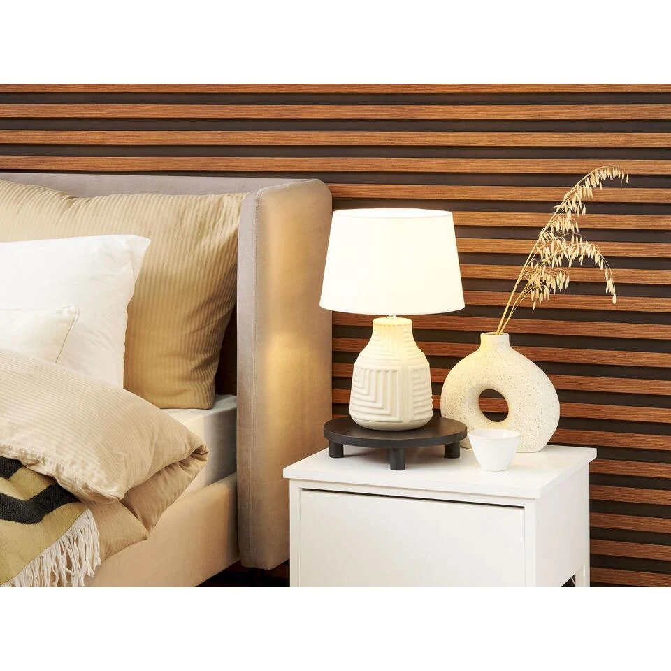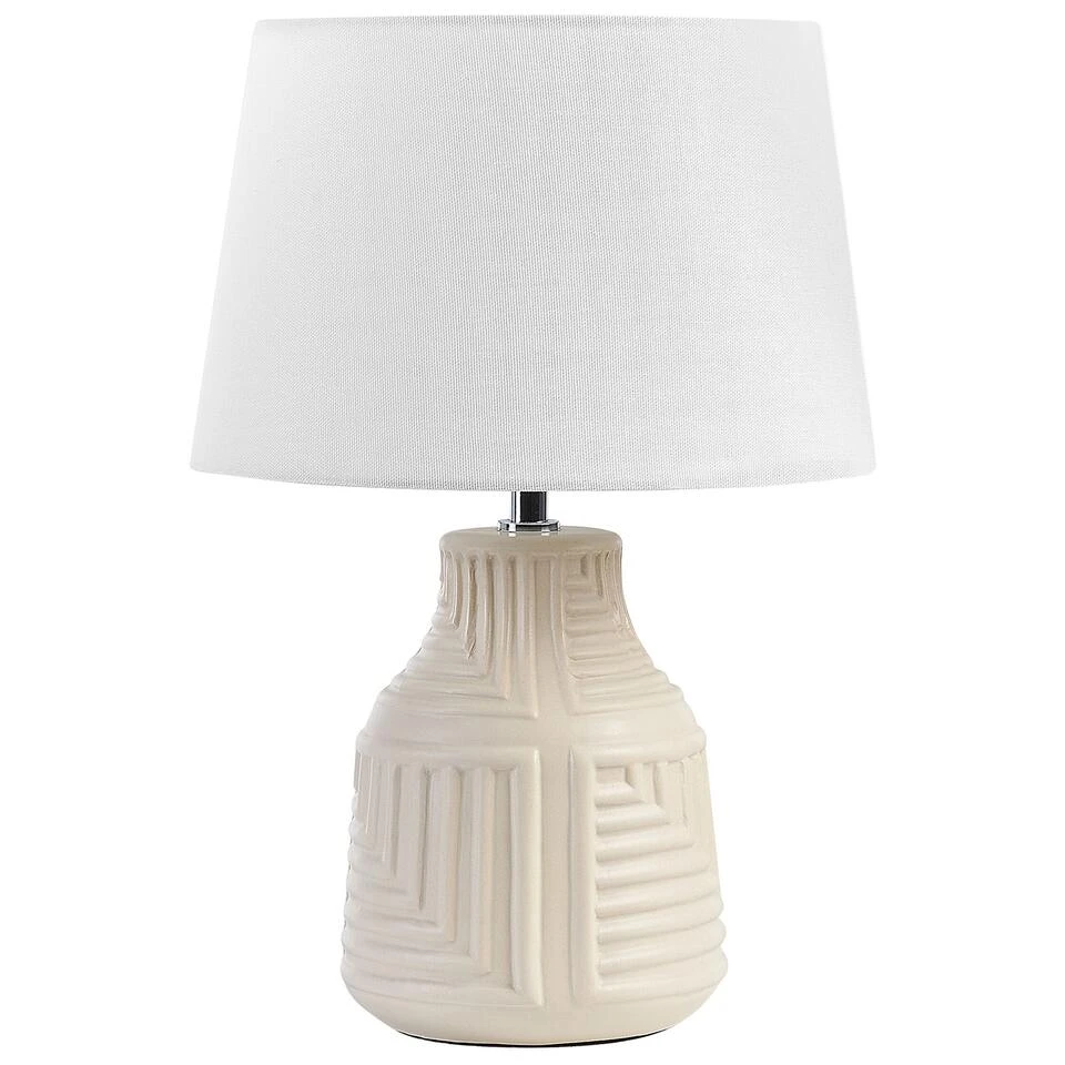 Moderne keramische lamp met getextureerde voet. Laat je huis opvallen met deze beige tafellamp. Het stuk, gemaakt van hoogwaardig keramiek, heeft een opvallende basis met een gestructureerd oppervlak, waardoor het een geweldige toevoeging is aan verschillende interieurstijlen. Dankzij de linnen kap is het licht warm en aangenaam en geeft het een sfeervolle verlichting aan het interieur.