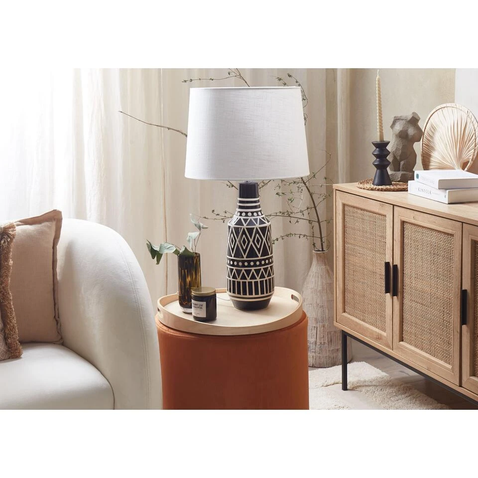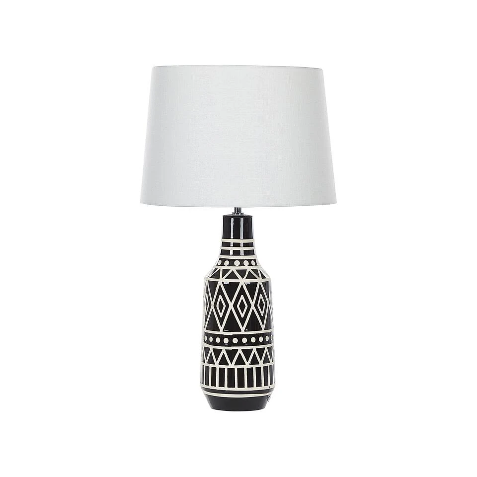 Etnisch Motief Tafellamp. Deze mooie tafellamp brengt een vleugje etnische stijl in je huis. De keramische basis heeft een aantrekkelijk patroon van geometrische vormen op een zwarte achtergrond. In combinatie met een kap van textiel zal de lamp er perfect uitzien als een decoratief accent op een nachtkastje of een salontafel. Met de witte stoffen kap is het een ideale bron van warm, sfeervol licht.