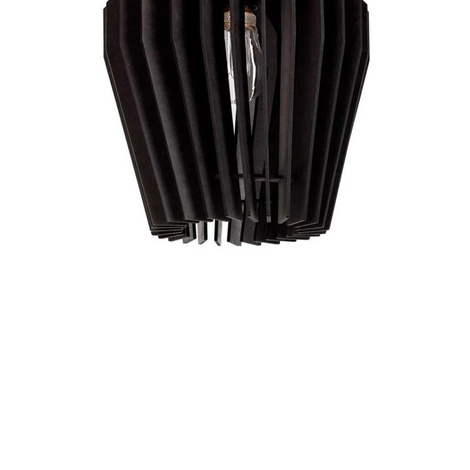 Deze leuke kleine hanglamp van hout geeft een mooi effect door het licht wat door de houten latjes probeert te ontsnappen. Geschikt voor een E27 lichtbron van maximaal 25 Watt (excl.). Deze Corner hanglamp is 24 cm breed en de kap heeft een hoogte van 27 cm. De totale hoogte is 135 cm en het meegeleverde zwarte stoffen snoer is simpel in te korten. Kleur: zwart hout.