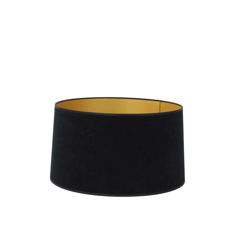 Geef je woonkamer een nieuwe look and feel met deze velours zwarte lampenkap. Dankzij de stof krijgt deze kap een luxe en moderne uitstraling. Hiermee tover jij je woonkamer in een handomdraai om. Deze lampenkap is geschikt voor tafellampen en staande lampen met een E27 fitting. Deze drum lampenkap is met de hand gemaakt in Noordwijk en is voorzien van een goudkleurige binnenkant, wat de kap een luxe finishing touch geeft. De kap heeft een afmeting van 45 x 42 x 25cm.