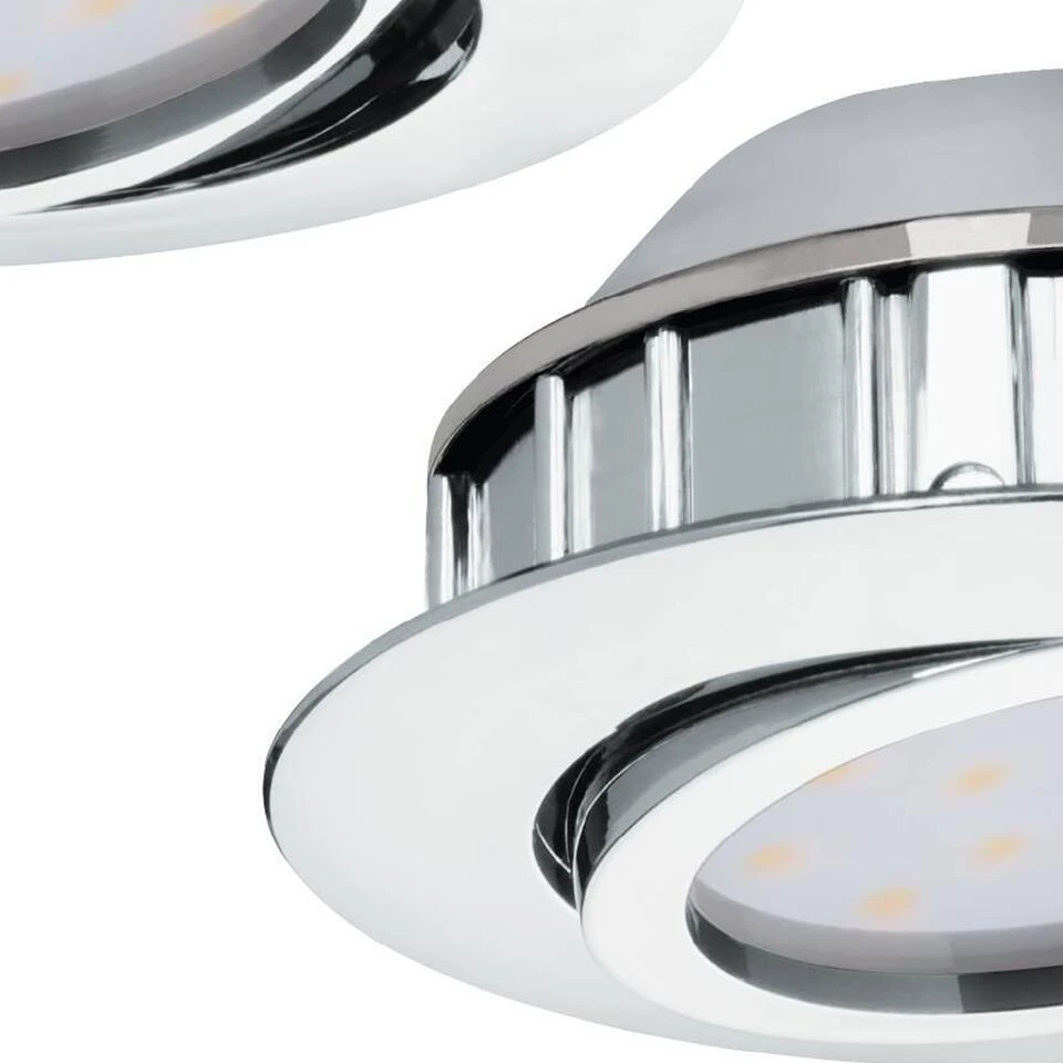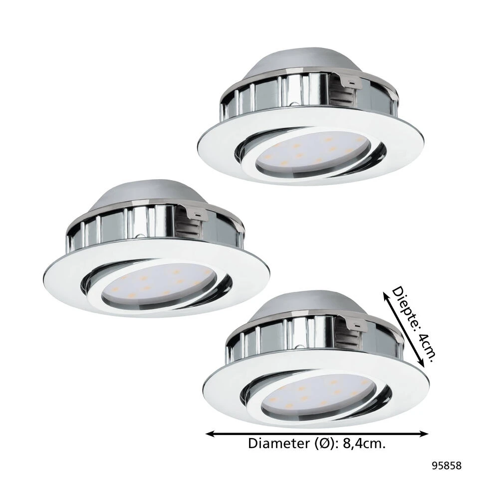 De EGLO Pineda is een inbouwarmatuur gemaakt van kunststof met een chromen afwerking. Deze inbouwspot heeft een energiezuinige geïntegreerde LED module met een wattage van slechts 6W. De Pineda geeft warm wit licht (3000K) en is dimbaar. Deze kantelbare spot heeft een diameter van 8,4cm. Door het moderne slanke design van dit armatuur, heeft u maar een inbouwdiepte van 35mm nodig. De spots zijn per drie verpakt.