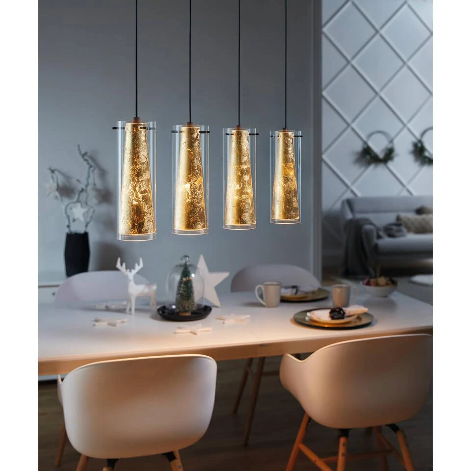 Hanglamp Pinto Gold van EGLO is met zijn speelse ontwerp een echt plaatje! Deze goud met zwarte lamp is niet alleen functioneel maar ook nog eens heel sfeervol. Hanglamp Pinto Gold is een echte eyecatcher in elke woon- en/of werkruimte. Maak jouw moderne interieur helemaal compleet met deze lamp. De hoogte van de lamp kun je zelf bepalen tot maximaal 110 cm. Je past eenvoudig de hoogte van de draden aan voor je Pinto Gold aan het plafond hangt.