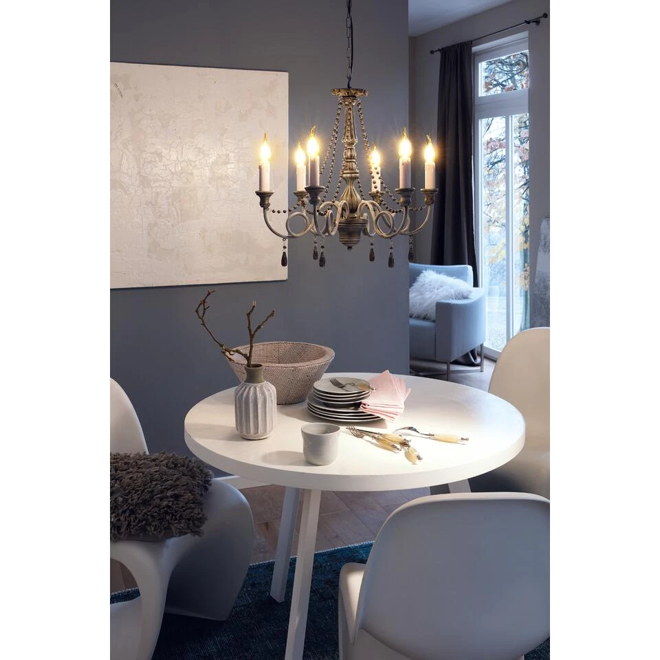Vintage en uniek design, dat is hanglamp Colchester van EGLO. Dit pareltje weet aan elk plafond de show te stelen. Deze lamp is ideaal om jouw interieur een klassiek en elegant tintje te geven. Hanglamp Colchester is door zijn eenvoudig toepasbaar in ieder interieur. De hoogte van de lamp kun je zelf bepalen tot maximaal 110 cm. Je past eenvoudig de hoogte van de draden aan voor je Colchester aan het plafond hangt.