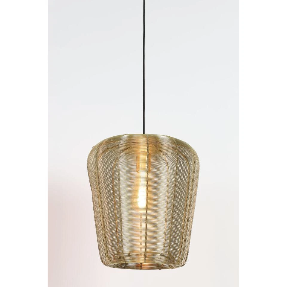 Hanglamp Adeta valt op dankzij de horizontale gouden metaaldraden. Deze metaaldraden zitten dicht op elkaar en laten het licht van de lichtbron sfeervol door. Ondanks dat er gebruik is gemaakt van metaaldraad heeft de lamp een zachte uitstraling door de ronde vormen. Ideaal voor in de eetkamer, slaapkamer of gang. De lamp is voorzien van 1 lichtpunt en is geschikt voor een lamp met een E27 fitting. Het lichtpunt van de lamp is dimbaar wanneer er een dimmer is ingebouwd in jouw lichtsysteem en gebruik wordt gemaakt van een dimbare lichtbron. De afmeting van deze lamp is Ø31×37 cm. De lamp is handgemaakt en dat maakt het product juist zo uniek! Bovendien maakt deze lamp deel uit van een serie en is verkrijgbaar in verschillende kleuren.