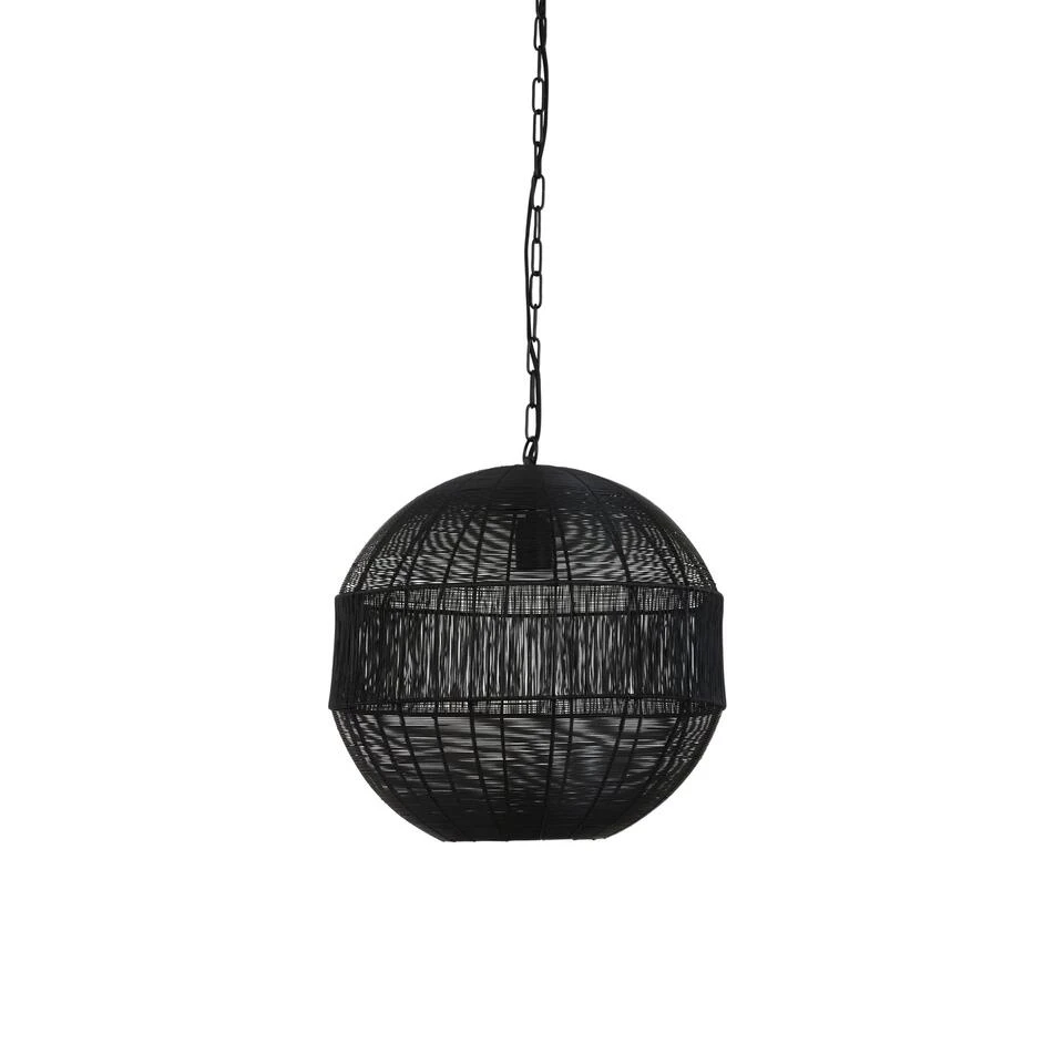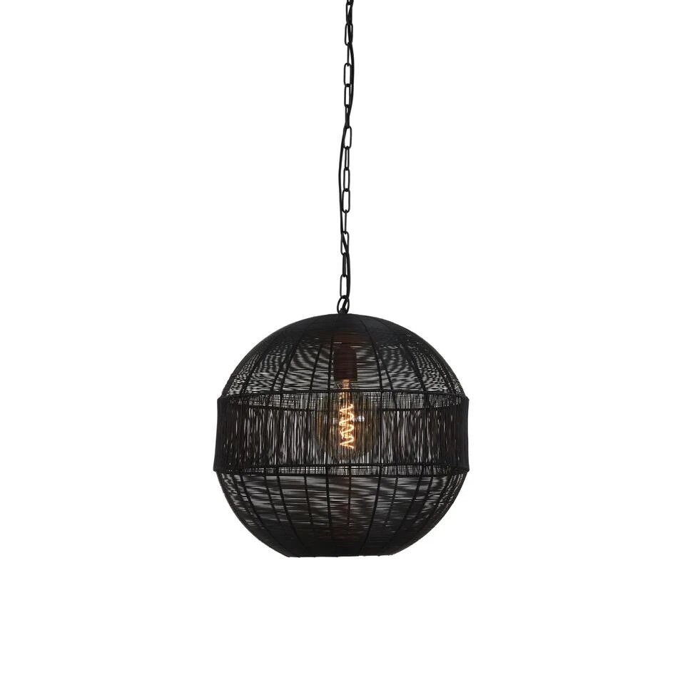 Opengewerkte hanglampen zijn helemaal in! Hanglamp Pilka is een zwarte bol hanglamp gemaakt van zwarte metaaldraden. De draden zijn zowel horizontaal als verticaal geweven waardoor de hanglamp een moderne uitstraling krijgt. Wanneer de lamp aanstaat krijg je hierdoor een gaaf effect op de muur. Door het formaat is deze hanglamp een échte eyecatcher boven een grote eettafel, in de hal en in ruimtes met een hoog plafond. Dit formaat hangt dankzij zijn grootte niet alleen aan een snoer, maar ook aan een metalen ketting. De afmeting van deze hanglamp is Ø45×47 cm en maakt gebruik van een lichtbron met een E27 fitting.