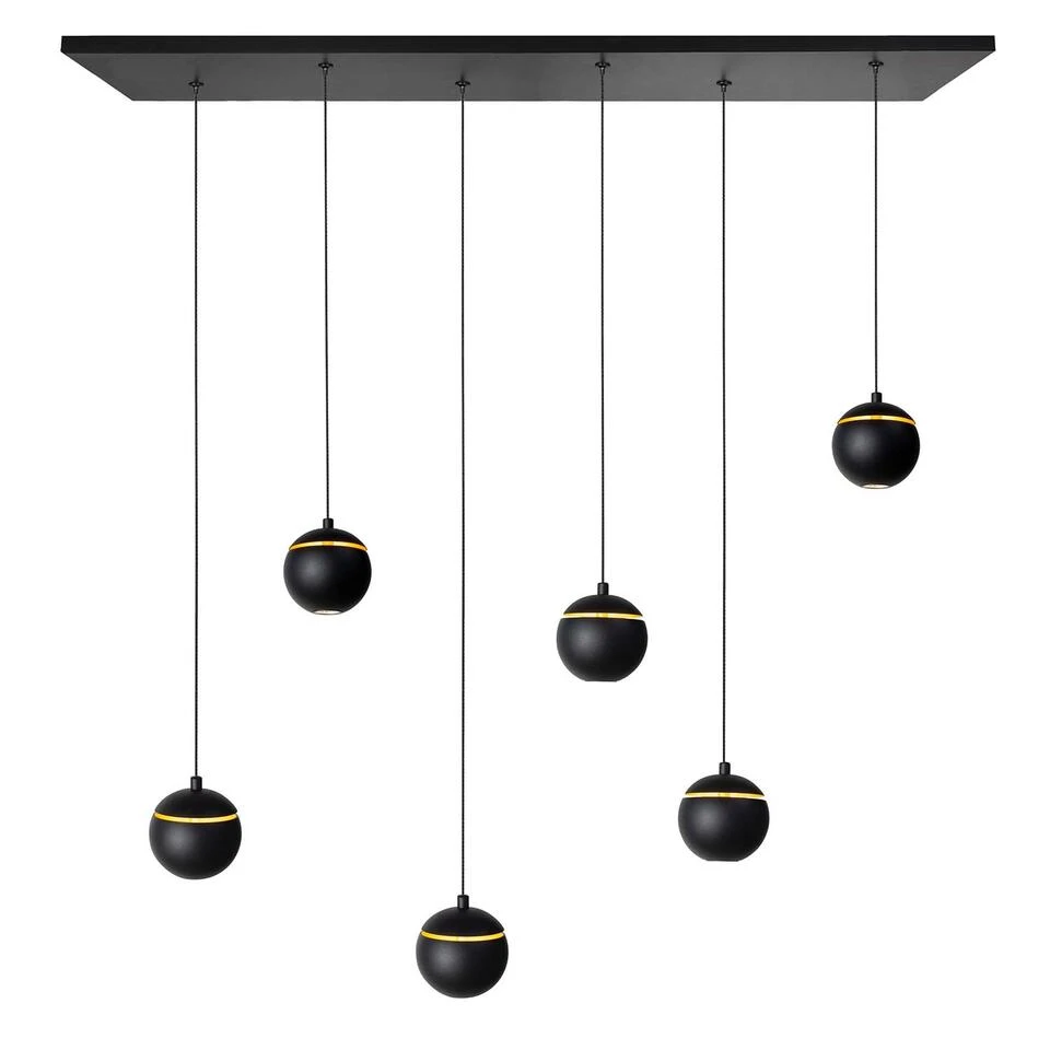 De bollen van deze langwerpige 6 lichts singapore hanglamp zijn zig-zag gemonteerd en hebben een diameter van 9 cm. De plafondplaat heeft een lengte van 116 cm en een breedte van 24 cm. De totale hoogte is 150 cm maar de hoogte is simpel te stellen. De LED lampen verbruiken ieder 4 watt en geven in totaal 2160 Lumen aan mooi warm wit licht (2700 Kelvin). Goed dimbaar met een LED dimmer (excl.).