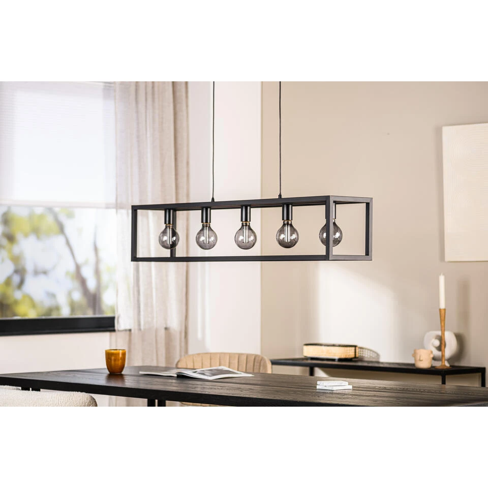 Hanglamp 5-lichts 120x25x160cm is een prachtige rechthoekige hanglamp met vijf fittingen. De kleur in combinatie met het open armatuur geven een trendy look aan de lamp. De 5 lichtbronnen hangen mooi in ƩƩn lijn in het frame, waardoor er voldoende licht boven de tafel en in de ruimte is.