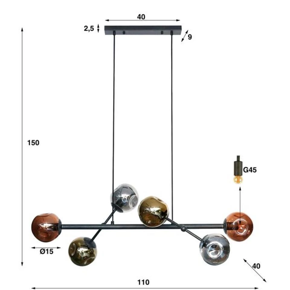 Deze hanglamp “molecule mix glass” is een blikvanger met zijn unieke design. Zes glazen kappen in chroom, goud en koper creëren een prachtig contrast en spelen met licht en kleur. De lamp is ook uitgevoerd in een vloerlamp. De lamp is tot 150 cm in hoogte verstelbaar. Er wordt aanbevolen LED lichtbron (8463) te gebruiken.