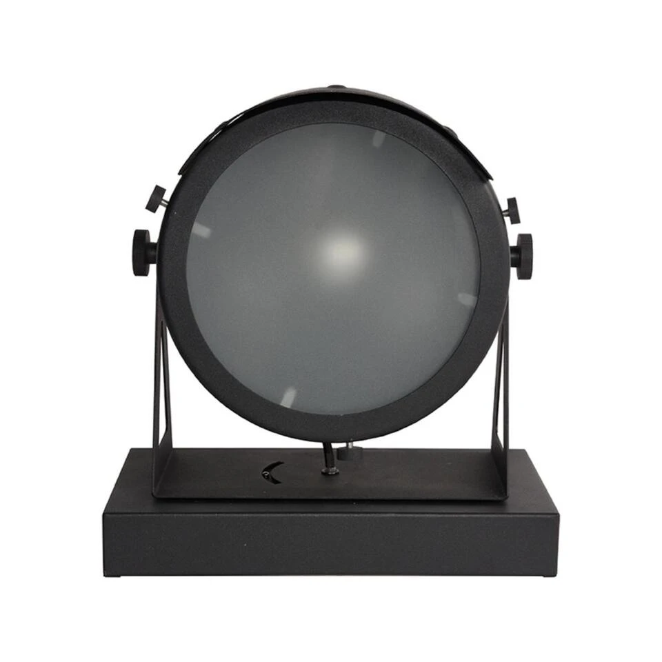 Tafellamp Cap, uitgevoerd in de kleur zwart heeft een grote ronde kap, geïnspireerd op de ouderwetse fietskoplamp. De kap is voorzien van een glasplaat, wat de lamp een extra luxe uitstraling geeft en daarnaast zorgt voor de perfecte lichtspreiding. Het driehoekige, metalen frame aan beide zijden, verbindt de kap met de robuuste, rechthoekige voetplaat. Het frame zorgt er tevens voor dat Cap van links naar rechts en van boven naar beneden te bewegen is, om het licht op de juiste plaats te laten schijnen.