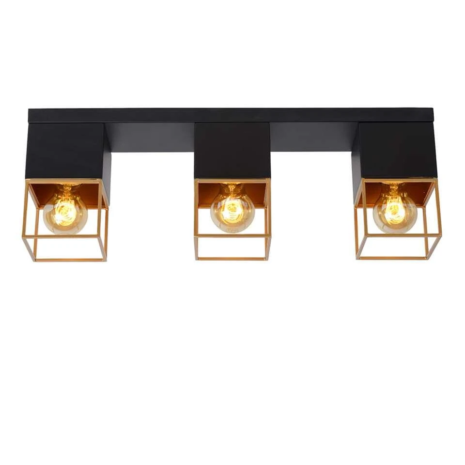Lucide plafonnière Rixt is een zwart met goudkleurige plafondlamp, gemaakt van metaal. Drie zwarte metalen rechthoeken vormen de basis waaruit een mooi lijnenspel komt in messingkleur. In het midden schittert steeds een ledlamp of kooldraadlamp. Met zijn drie lichtbronnen op een rijtje past Rixt zowel in de eetkamer, keuken als woonkamer. Ook in een hal kan je hem zonder problemen installeren. Zo geef je die ietwat vergeten ruimte meteen voldoende karakter. Je sluit Rixt eenvoudig aan op een dimmer. De lamp heeft een E27 fitting.