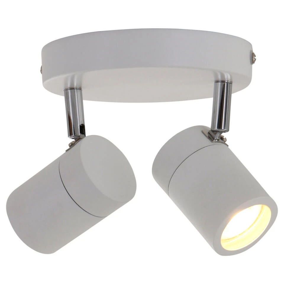 Witte moderne 2-lichts spot uit de Upround LED serie. De spot kan zowel aan de wand als aan het plafond gemonteerd worden. De spot is voorzien van een GU10 fiting en wordt geleverd inclusief 4.6 watt lichtbron met dim-to-warm functie. Dit staat voor veel licht is fris wit licht, weinig licht is warm (geel) licht. Sluit u de lamp aan op een externe dimmer, deze wordt niet mee geleverd, dan kunt u deze dimmen. De kleurtemperatuur is in te stellen van 1800 Kelvin tot 2700 Kelvin en heeft een lichtopbrengst van 350 lumen. De spot heeft een diepte van maximaal 15 centimeter en is draaibaar en kantelbaar. Heeft een IP44 waarde, hierdoor is de Upround LED geschikt voor in de badkamer in zone 2.