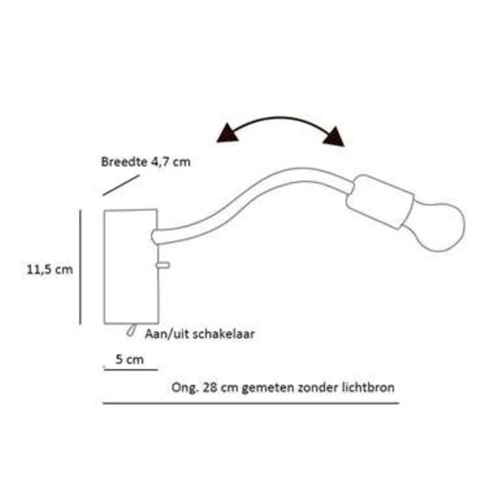 Deze wandlamp heeft een flex met een lengte van 20 cm (totale lengte zonder lichtbron is 28 cm) en het wandplaatje heeft het volgende formaat: 11,5 x 4,7 cm. Wordt geleverd zonder snoer maar er zit een opening aan de onderkant om simpel een snoertje te monteren. Geschikt voor een lichtbron van maximaal 40 Watt (Excl.). Kleur: zwart.