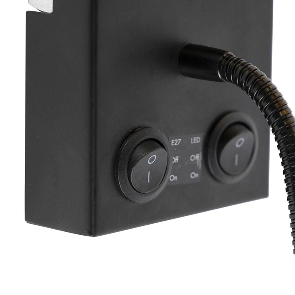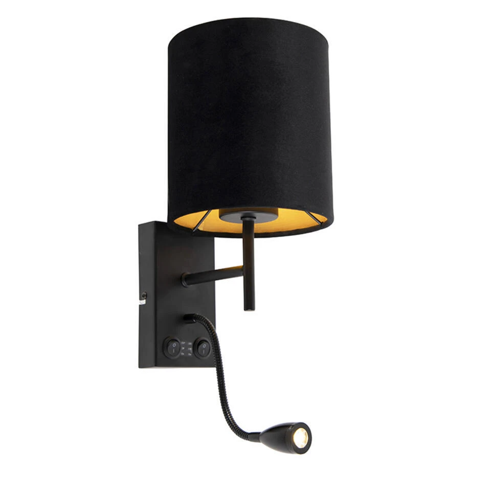 Een Art Deco touch in je interieur, dat is deze Stacca. Deze wandlamp is perfect om je muur een moderne look te geven. Het is een praktische en stijlvolle wandlamp uitgevoerd in een zwarte velours kap met gouden binnenkant. Dat zorgt voor een leuk lichteffect in de kamer. De charmante wandlamp is zo gemaakt om jou te voorzien van de perfecte verlichtingscombinatie door de ingebouwde leeslamp die je zelf kan verstellen naar jouw zin. Met een lichtbron voor een E27 fitting (40 Watt) maak je de Stacca af. De leeslamp beschikt over een geïntegreerde LED module van 100 lumen en 2700 Kelvin (warm licht). Hij is handig in gebruik, dankzij de aan/uit knoppen op de montageplaat van de lamp. Hierdoor is de lamp en de leeslamp afzonderlijk te bedienen. De kap heeft een diameter van 16 cm. De complete wandlamp heeft een hoogte van 47 cm. De flexibele leesarm heeft een lengte van 24 cm. Perfect als leeslampje in jouw slaapkamer!