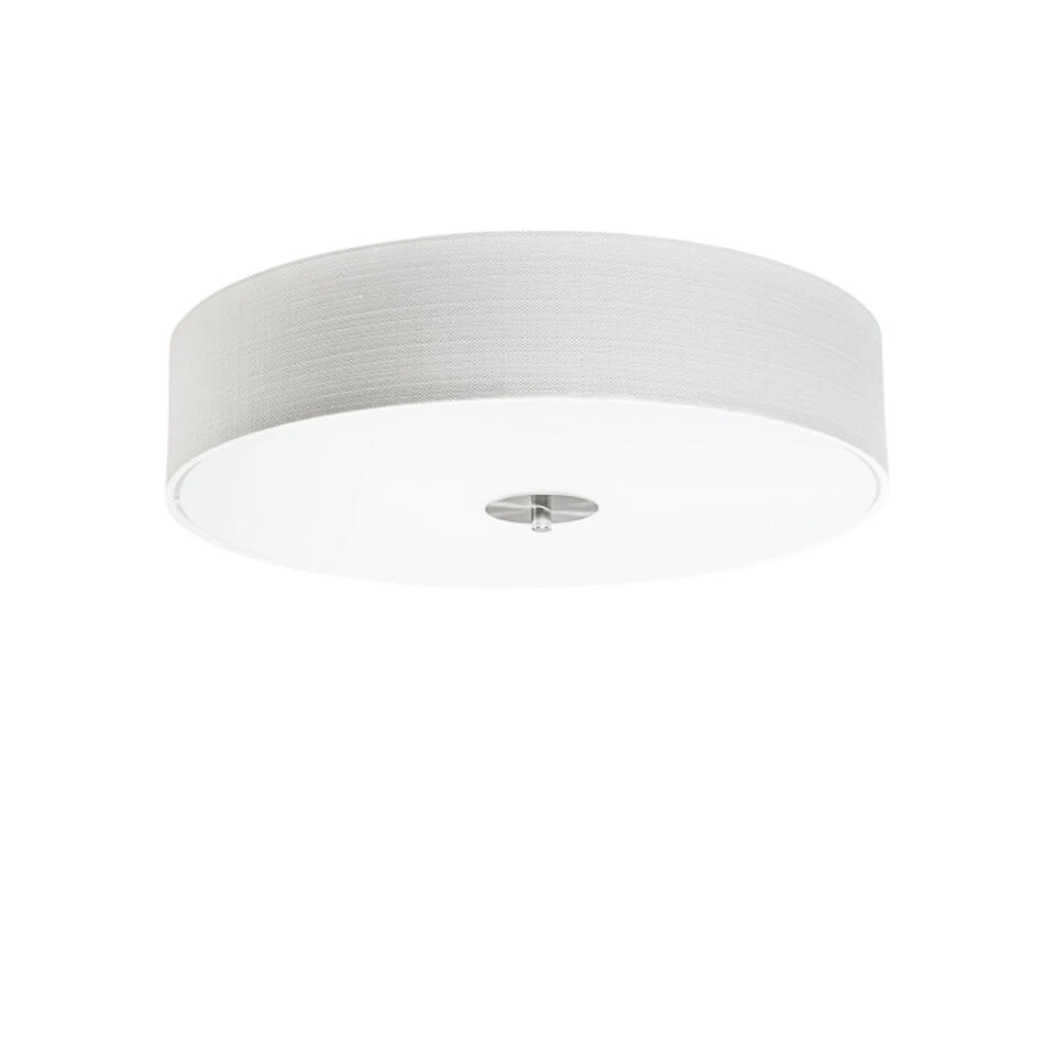 Een tijdloze ronde plafonnière met een kap in een tijdloze witte kleur. De stof die gebruikt is voor de kap is gemaakt van jute. De plafondlamp Drum Jute is prachtig afgewerkt met een matte glasplaat aan de onderzijde waardoor een rustig lichteffect gecreëerd wordt in huis. De lamp heeft een diameter van 50 cm en een hoogte van 13 cm. De lamp is dimbaar met externe dimmer (dimmer niet inbegrepen). Je maakt je Drum Jute compleet met vier lichtbronnen passend in een E27 fitting (elk max. 40 Watt). Een aangename plafondlamp in elke ruimte in huis!