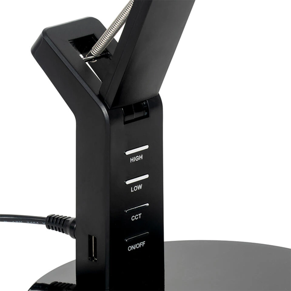 Ben je op zoek naar een fijne tafellamp voor het lezen van de krant, een boek of voor tijdens het werken? Dan is Edward wat je zoekt! Deze tafellamp is gemaakt van aluminium met kunststof en is afgewerkt in het zwart. Hij heeft een totale hoogte van 45 cm, lengte van 32 cm en breedte van 17 cm. De voet heeft een diameter van 17 cm. Edward wordt inclusief snoer (130 cm) en stekker geleverd. De tafellamp beschikt over niet-vervangbare LED-verlichting met een lichtvermogen van 480 lumen en 3000-6000 Kelvin. De lichtsterkte is erg hoog, maar gelukkig te verstellen. Op de poot van de tafellamp staan verschillende standen om de lichtsterkte aan te passen, zo heb je altijd het gewenste licht. De tafellamp beschikt ook over een USB-aansluiting voor bijvoorbeeld het opladen van je smartphone. Tafellamp Edward is waar je naar op zoek bent!