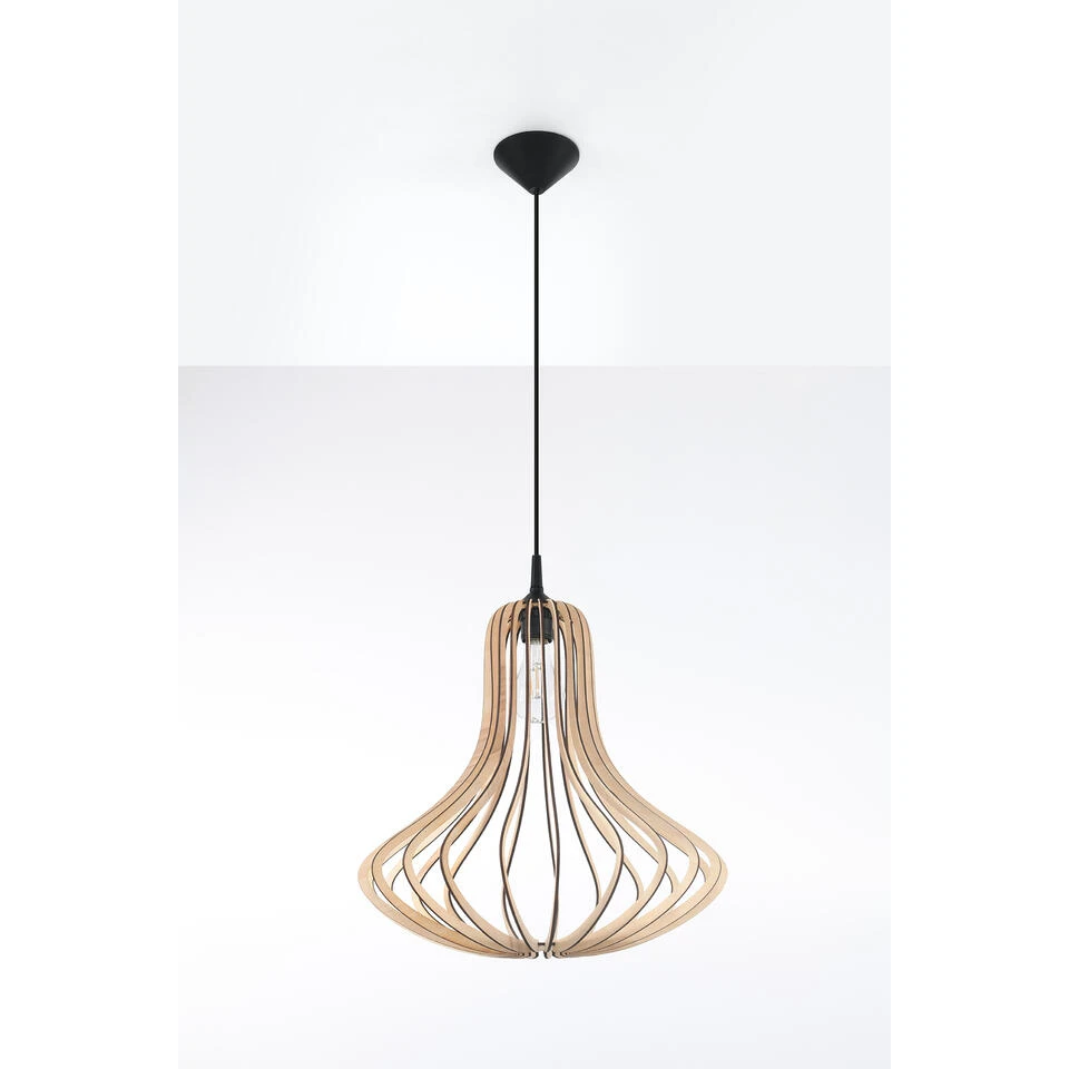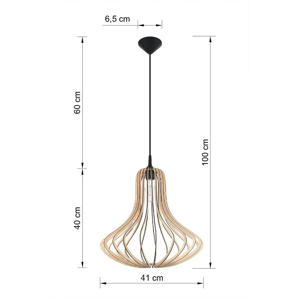 Deze Elza hanglamp bestaat uit houten latjes die in elkaar geschoven zijn, hierdoor onstaat er een open hanglamp waarbij de lichtbron goed zichtbaar is. Deze hanglamp is geschikt voor een E27 lichtbron van maximaal 10 Watt (Excl.). De hoogte is maximaal 100 cm en simpel inkortbaar, de totale breedte is 41 cm. Dit armatuur is gemaakt van naturel hout en heeft een licht bruine kleur, het snoer is zwart van kleur. 5 jaar garantie.