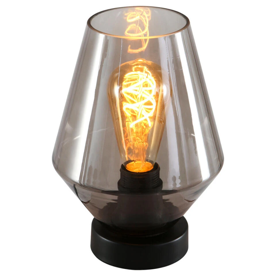 De tafellamp Ancilla is een zwarte tafellamp met een donker kleurig glas. De totale hoogte is 32 centimeter. Voorzien van een E27 fitting. (Lichtbron niet meegeleverd) Het armatuur is voorzien van een zwart snoer waar een aan / uit schakelaar in is verwerkt.