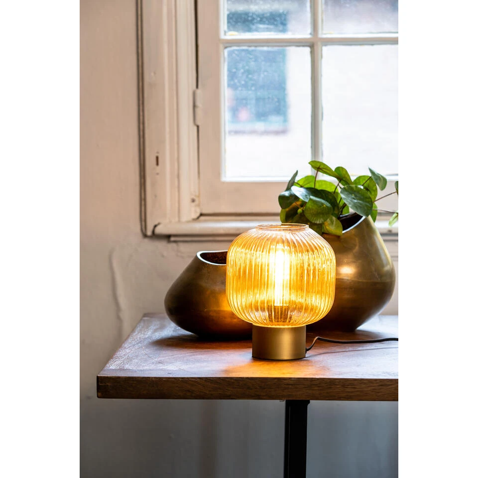Deze moderne lamp valt op dankzij zijn geribbelde glas. De tafellamp is gemaakt van brons metaal en amber glas. Het amber glas is niet alleen mooi, het zorgt er ook voor dat de lamp extra sfeervol licht geeft. De retro lamp komt van pas bij het studeren, lezen van een goed boek of dient als gezellige lichtbron op tafel. De afmeting van deze compacte tafellamp is 20 x 20 x 24,5 cm.