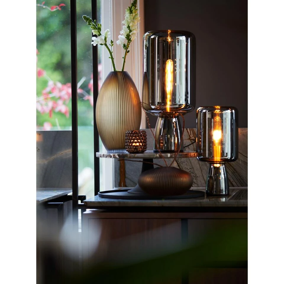 Een tafellamp is multifunctioneel en daardoor een musthave voor in huis. De Lotta tafellamp heeft een modern design en is gemaakt van glas. De tafellamp heeft een zilveren kleur en is daarom goed te combineren met een luxe of modern interieur. Je kan een tafellamp namelijk op je nachtkastje zetten en gebruiken als nachtlampje of plaats hem op je bureau en gebruik hem als bureaulamp. Tafellampen brengen op een subtiele manier licht naar binnen en zien er daarnaast ook nog eens erg leuk uit. Je hoeft tafellampen niet alleen op tafels te zetten. Een tafellamp staat namelijk ook erg leuk in een open kast of dressoir. In de vensterbank zorgt een tafellamp voor sfeer wanneer het donker wordt buiten. De afmeting van de tafellamp is Ø21×45 cm.